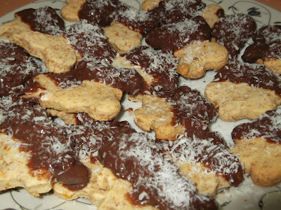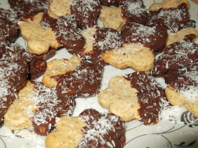 Bu kurabiyelere, yeni nesil kurabiye adını verdim, daha önce yaptığım kurabiyeler, anam babam usulü kurabiyelerdi hatırlarsınız. Dünkü şeker hamuru süslemeler için, yaptığım kurabiye yapılışının aynısı.Sayısı oldukça fazla olduğu için ikiye böldüm. bu kez erimiş çikolataya batırılmışını yaptım, bu da başka bir çeşit oldu.
