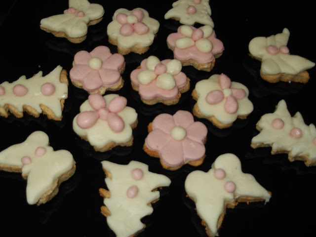 Fırından çıkan kurabiyeler soğurken, şeker hamurunu açalım. Masaya bu kez mısır nişastası serpelim, yapışmaması için.Şeker hamuru ile süslemek için aynı kalıpları kullandım. biraz su ile ıslatarak yapıştırdım. Gerisi hayal gücünüze kalmış, farklı renkler olsaydı daha değişik süslemeler yapılabilir. Bu konuda eğitim almış çok başarılı arkadaşların hakkını yemeyelim, benim acemi işi, ama çok zevkli olduğu bir gerçek. Hepinize afiyet olsun.