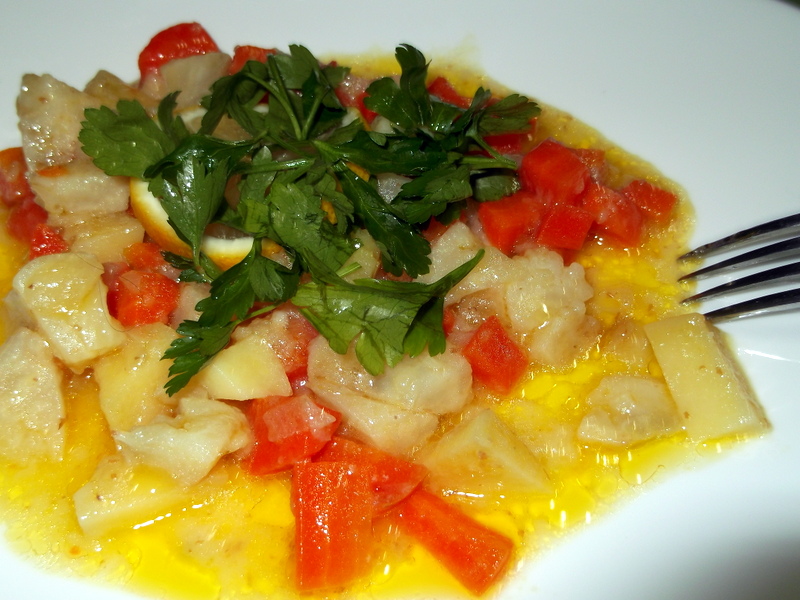 Kuru soğanı yemeklik doğrayıp zeytinyağıyla birlikte soteleyelim.Havuçları da ilave edelim. Birlikte olunca değişik bir aroma tadı oluyor, aslında hepsi çiğden karıştırılıp pişiriliyor, ama ben mutlaka soğan ve havucu soteliyorum. Daha lezzetli oluyor. Kerevizleri ve patatesi de ayıklayıp, yıkadıktan sonra yemeklik doğrayalım ve tenceremize ilave edelim. Bir yemek kaşığı un, bir çay kaşığı şeker,tuz koyalım ve karıştıralım, en son bir portakal suyunu ilave edelim kapağını kapatalım, pişirmek için. Suyu az gelirse normal su ilave edelim. Piştiğinden emin olduğumuzda, servis tabağına alalım.
