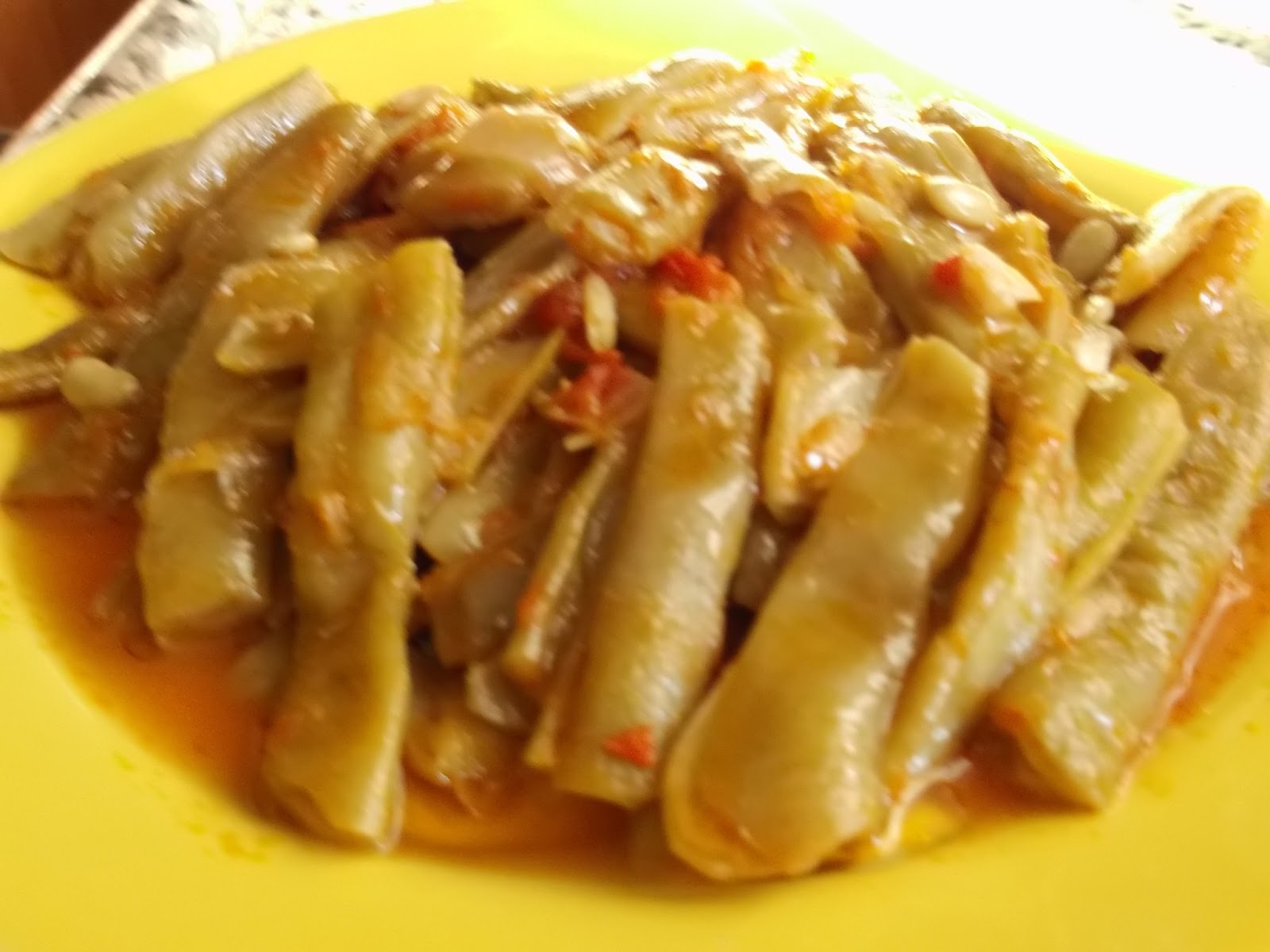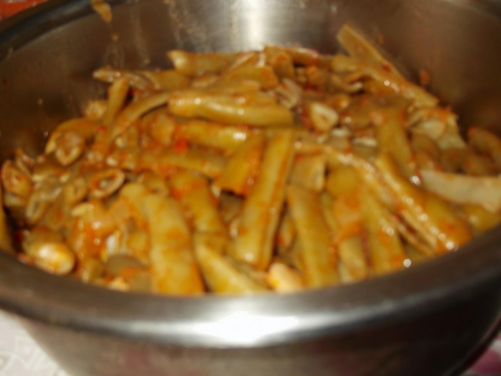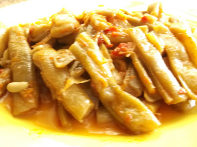 Taze fasulyeyi kış aylarında, aynı yaz mevsimindeki lezzette pişirmek mümkün. Bunun için yaz sonu aldığımız fasulyeleri ayıklayıp, yıkadıktan sonra bol domates rendesiyle ocağın üzerinde biraz sarartıyorum. Soğuyunca torbalara koyuyorum. Dondurucuda en fazla üç ay durabilir. Dolaptan çıkardığımızda çözülmesi için tezgahın üzerine alıyoruz. Yaz aylarında pişirdiğim fasulye yemeğinden farklı pişirdim. Yazın her bir malzemesini çiğden soğanı, sarımsağı ve domatesi karıştırıp, düdüklü tencerede 15-20 dakikada pişiriyorum. Fakat bu dondurucudan çıkardığım fasulyeyi önceden domatesle biraz ocakta çevirdiğim için daha yumuşak. Bu nedenle Zeytinyağında yemeklik doğranan soğanı soteleyelim. Soğanlar şeffaflaşıncaya kadar, hem acısı çıkıyor, hem tatlanıyor. İçinde domatesi bol miktarda var ama, isterseniz bir tatlı kaşığı salça ile de renklendirebilirsiniz. Fasulyeleri tencereye koyalım ve karıştıralım. Sarımsakları doğrayalım iki diş, tuz, çekilmiş karabiber, bir çay kaşığı toz şeker ilave edelim. Yemeğimizi karıştırıp, üzerine bir çay bardağı ılık su koyup, hemen ocağa alıp orta ateşte kapağı kapalı pişirelim.