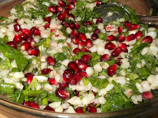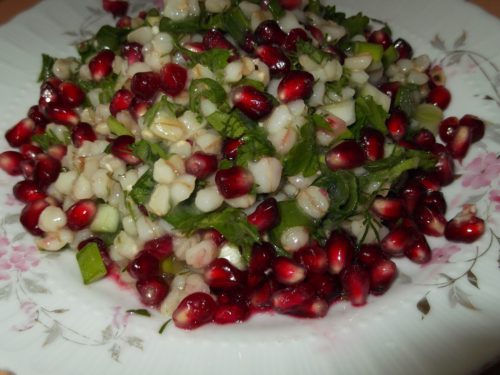 Haşladığımız buğdayı süzelim, karıştırma kabına alalım. İnce kıydığımız yeşillikleri ilave edelim. Küçük bir kaseye limon suyu, nar ekşisi ve zeytin yağı çırpalım. Tuzunu koyalım ve buğdayların üzerine dökelim. Servis tabağına alalım. Ayıkladığımız nar taneleriyle süsleyelim.
