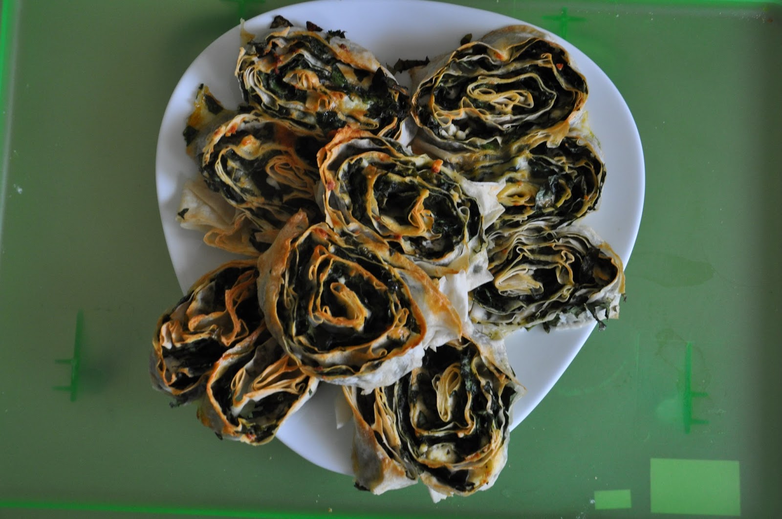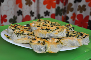 Pratik börek yapmak isteyenler için, çok basit ve yapımı çok kolay bir tarif. Yapılış resimlerini çekemedim. Üç yufkayı sırayla masaya açalım, aralarına ıspanaklı peynirli iç malzeme hazırlayalım. Üç yufkaya ,aralarda iki iç malzeme koyarak, bir rulo elde edelim. Ruloyu keskin bir bıçak yardımıyla iki parmak enliliğinde dilimleyelim. . Bir kaseye, sıvı yağ ve bir yumurta çırpalım. Tepsiye fırın kağıdı serdikten rulo dilimlerini yerleştirelim .hazırladığımız yumurtalı karışımı fırçayla sürelim .Önceden ısıtılmış fırına alalım.Üstü iyice kızardığında fırından çıkaralım.