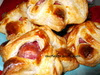milföy yaprağının içine sosisi koyup, uçlarını birleştirelim. Yumurta sarısı sürelim, yağlı tepsiye dizelim ve önceden ısınmış fırına koyalım.
