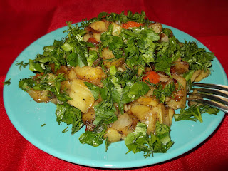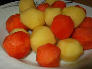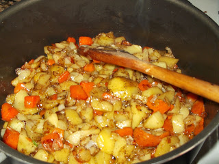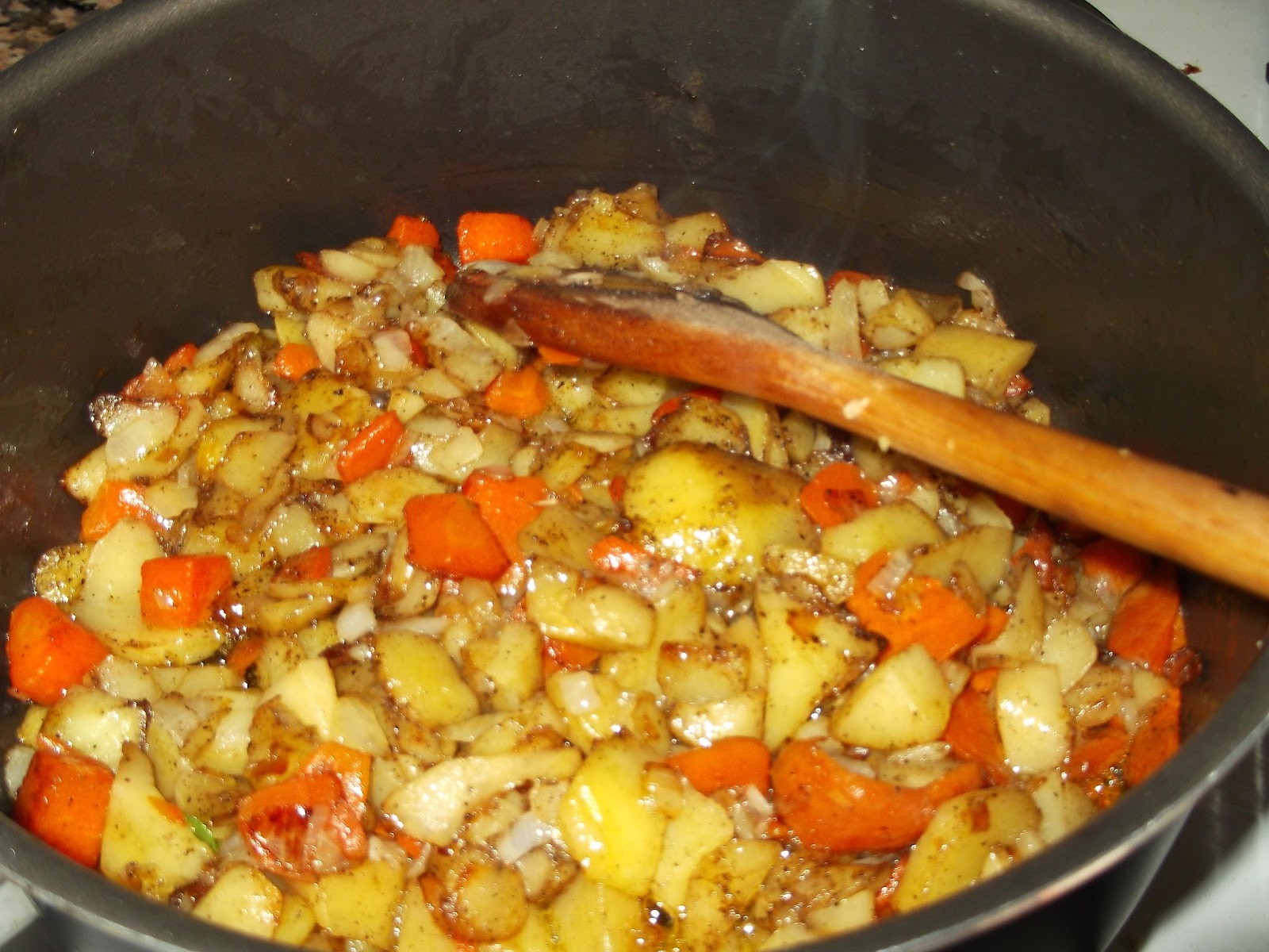 Geçenlerde hatırlarsınız patates parçacıkları vardı, Sulu köfte yaparken patates ve havuçları yuvarlarken artan parçalar. Bunları değerlendirmek gerekir demiştim. İşte zamanı geldi, poşete koyup dondurucuya atmıştım. Bu gün çıkardım, çözüldü. Bir kuru soğanı soteleyelim. Soğanlar pembeleşinceye kadar pişirelim. Patates ve havuç parçacıklarını ilave edelim. Kapak kapatmadan kavurmaya devam edelim.