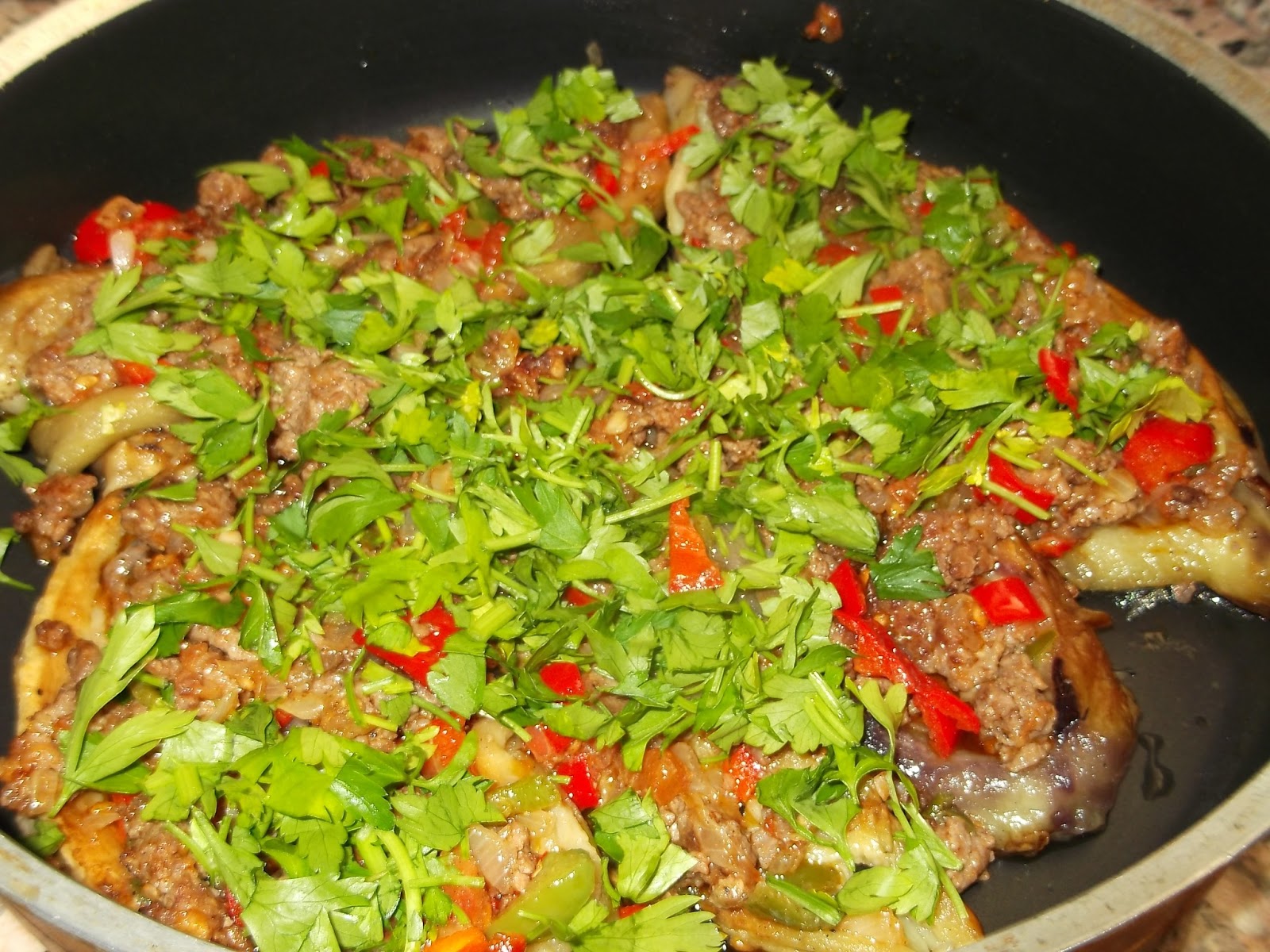 İlk önce patlıcanları közleyelim ve pişince kabuklarını temizleyelim. Ayrı bir tavada önce kıymayı ,suyunu çekene kadar kavuralım. Yemeklik doğradığımız soğanı birlikte soteleyelim. Daha sonra, kırmızı ve yeşil biberleri ilave edelim. Maydanoz ve baharatlarını da ilave edelim. Közlenmiş patlıcanların içlerini oyup, kaşıkla iç harcı paylaştıralım. En son işlem, domates maydanoz ile süsleyebiliriz. Şimdi, ister fırında, ister tencerede pişirebiliriz. Çok az sıvıyağla pişirelim. Yemeğimiz yarı pişmiş durumda olduğu için, çok çabuk pişiyor, Servis yaparken yanına cacık ilave edebilirsiniz. Çok az yağ kullandım, siz isteğinize göre çoğaltabilirsiniz. Afiyet olsun.