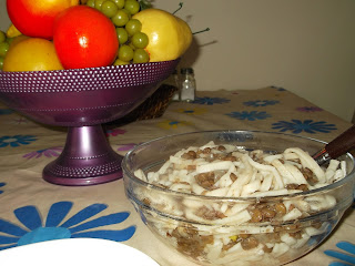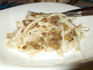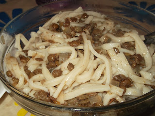 - İlk önce ev eriştesini sıcak tuzlu suda yumuşayana dek haşlayalım. Suyunu aldırma usulü de, yapabiliriz. Suyunu çektirene kadar pişirelim. Bunun için, yağda kavurmak gerekir erişteleri, daha sonra sıcak su eklenir. Suyu çekene kadar pişirilir. Diyet nedeniyle yağda kavurmak istemedim. O yüzden suda haşlama yaptım, makarna gibi. Neyse gelelim yemeğimize ,Haşladığımız erişteleri süzelim. Ayrı bir tavada soğanı soteleyelim sıvı yağda, Haşladığımız ve süzdüğümüz mercimekleri ilave edelim ve karıştıralım. Tuzunu ,karabiberini ekleyelim ve karıştıralım. Servise hazır. Afiyet olsun.