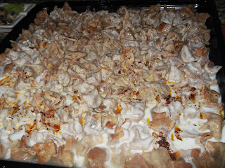 çok ince olmamak şartı ile yufkalarımızı açalım. Bıçakla karelere bölelim ve ortalarına harçtan kapanacak şekilde yerleştirelim. Küçük bohçalar halinde uçlarını bastırmadan birleştirelim. Yağlı fırın tepsisine, sıkışık bir şekilde, dizelim.175 derece de kızartalım. Üzerine sarımsaklı yoğurt ve tere yağı kızdırıp dökelim.