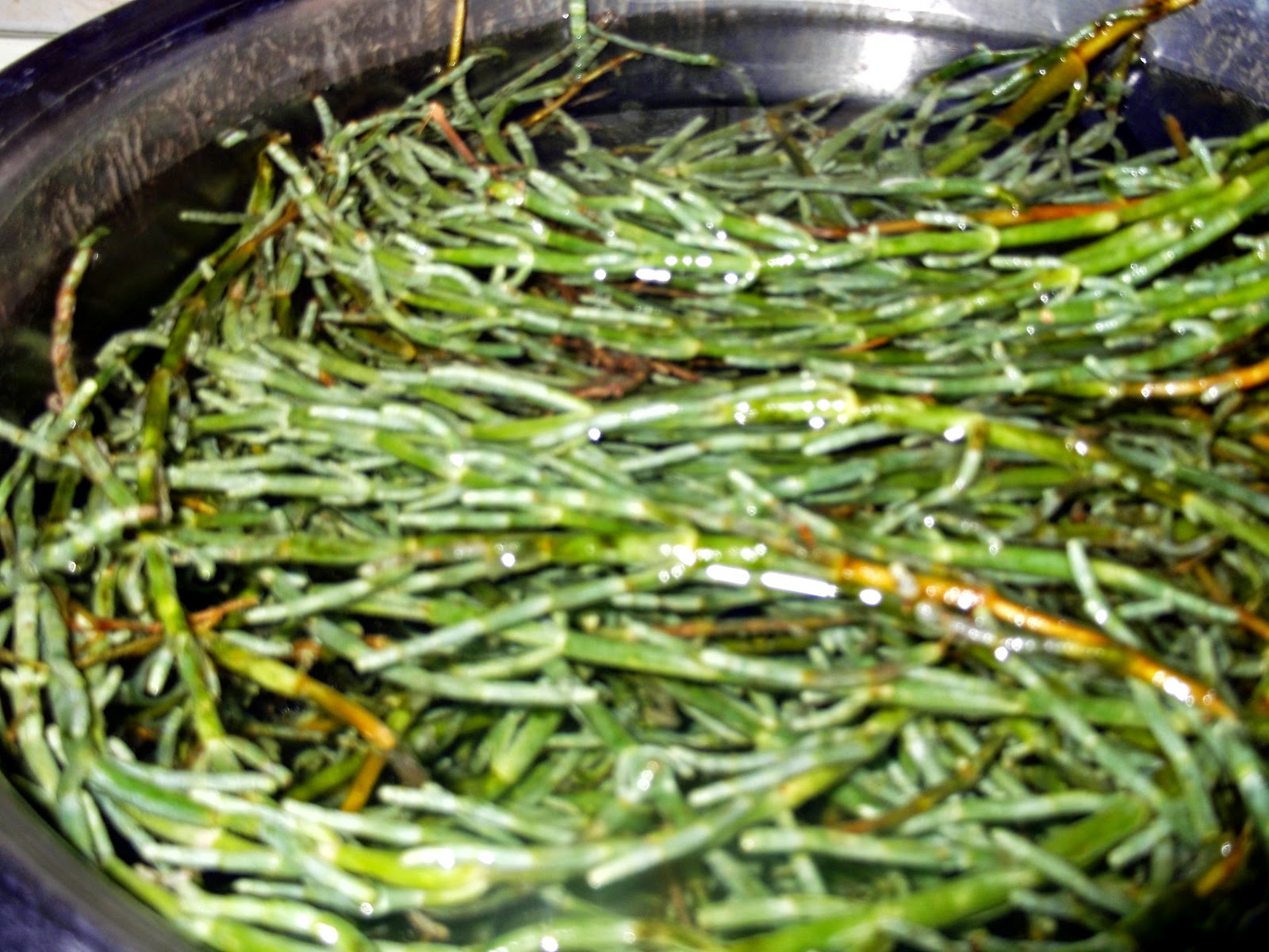 Bu kadar açıklamadan sonra tarifime geçmek istiyorum. Her zaman ki gibi, yine Fethiye köy pazarından aldığım, deniz börülcesini, bol su ile haşladım. Tuz fazla koymayın, yeterince kendi tuz barındırıyor.İçindeki sert dalları sıyırıp, yeşil kısımlarını ayıkladım. Ayıklaması çok kolay , sap kısımlarını sıkıca elinizde tutup ,yeşil kısımlarını sıyırın.İki şekilde sos hazırlayabilirsiniz. :