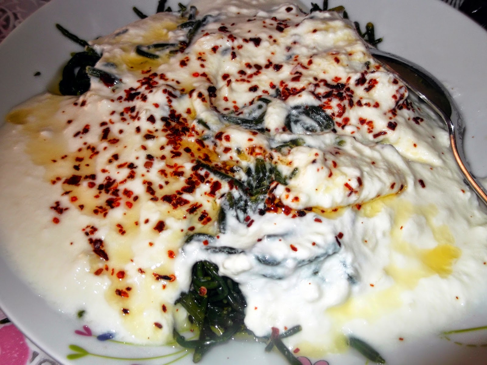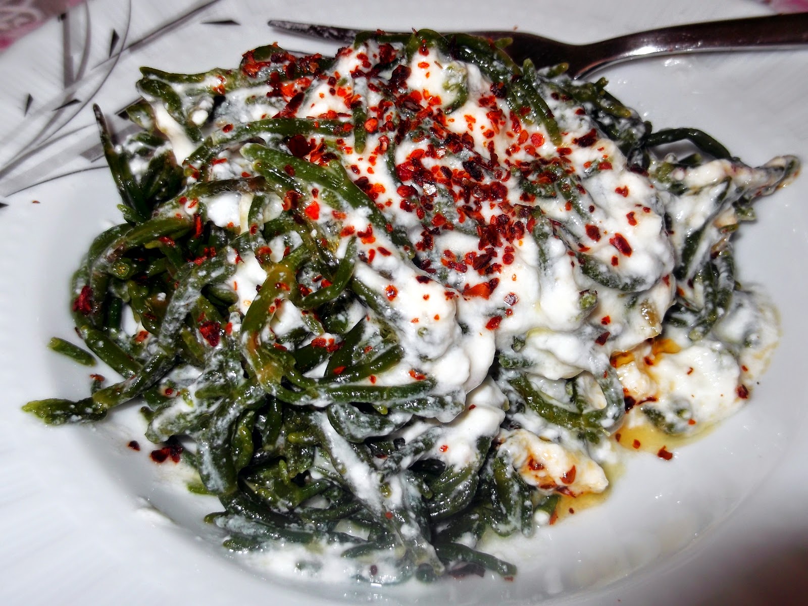 malzemeler kısaca bir bağ deniz börülcesi, süzme yoğurt bir kase, üç diş sarımsak arzuya göre, sızma zeytinyağı pul biber