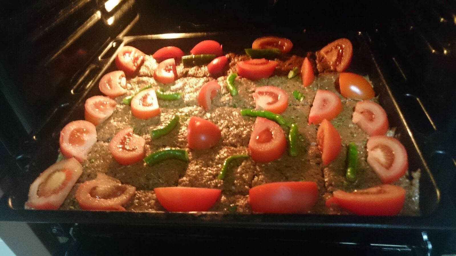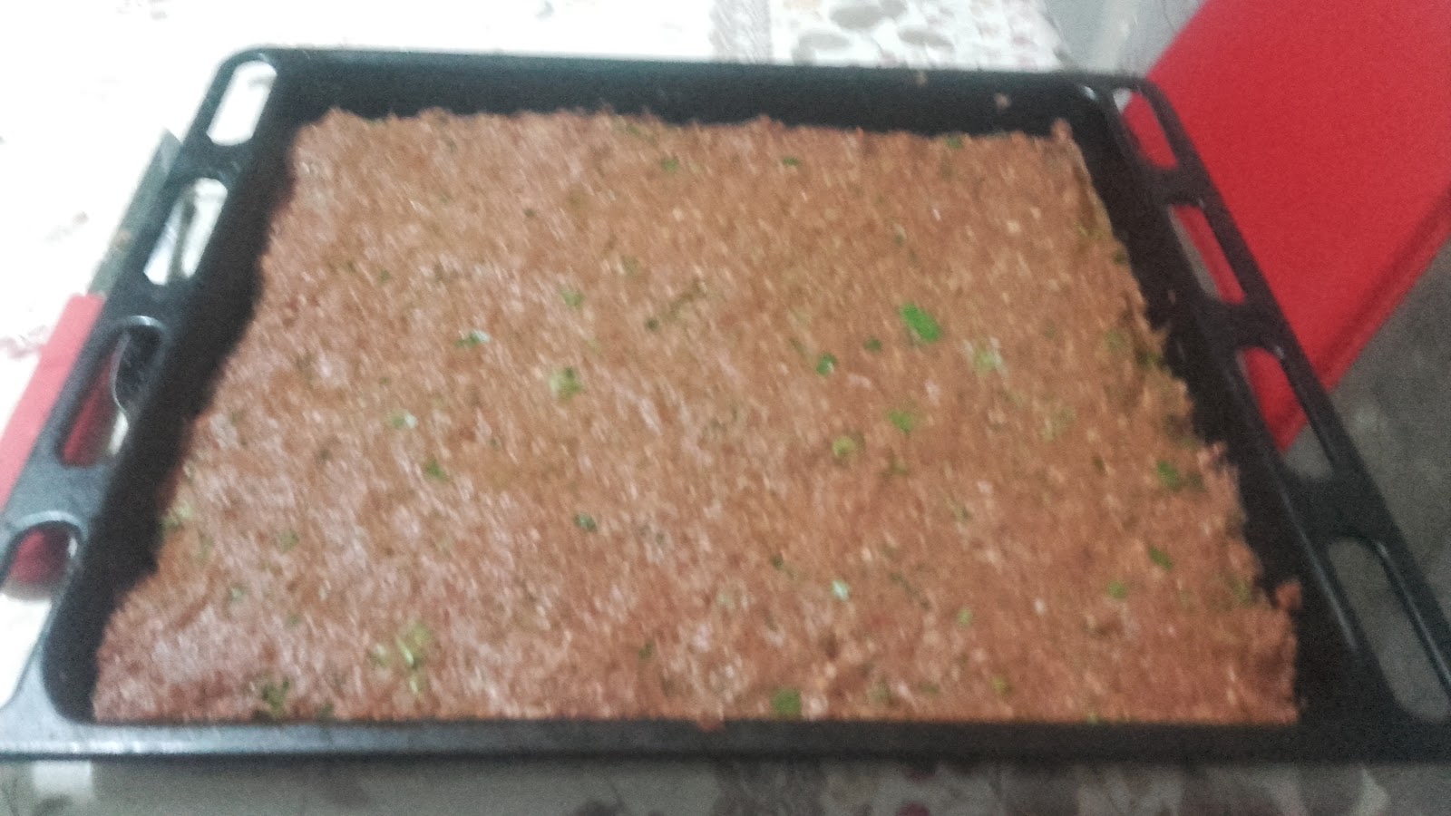 Soğanı, biberi,domatesi, sarımsağı,maydanozları ince ince kıyalım .Ya da rondodan geçirelim.Kıymayı önce biber salçası ile güzelce yoğuralım. Daha sonra ince kıyılmış harcımızı ve baharatları da ekleyerek, yoğurma işlemine devam edelim. .Tepsiye salçayı sürüp, elimizle tepsiye kıymayı eşit miktarda yayalım .